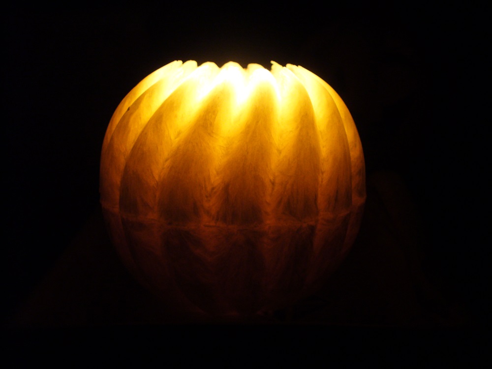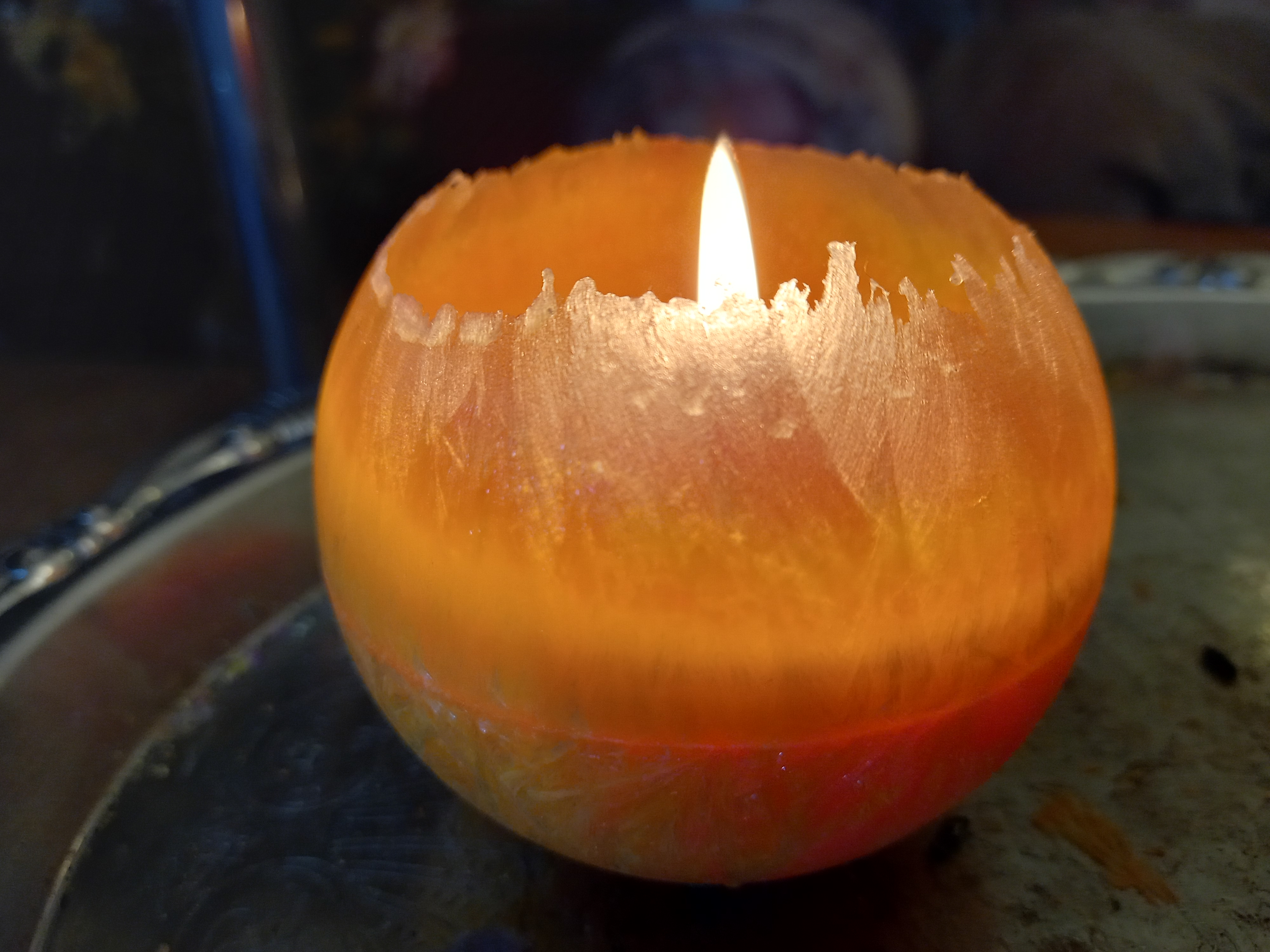Svíčka koule vlnitá žlutá s vůní 100% přírodní silice Litsea Cubeba, působí příznivě jako antidepresivu, afrodisiakum, čistí vzduch a napomáhá koncentraci